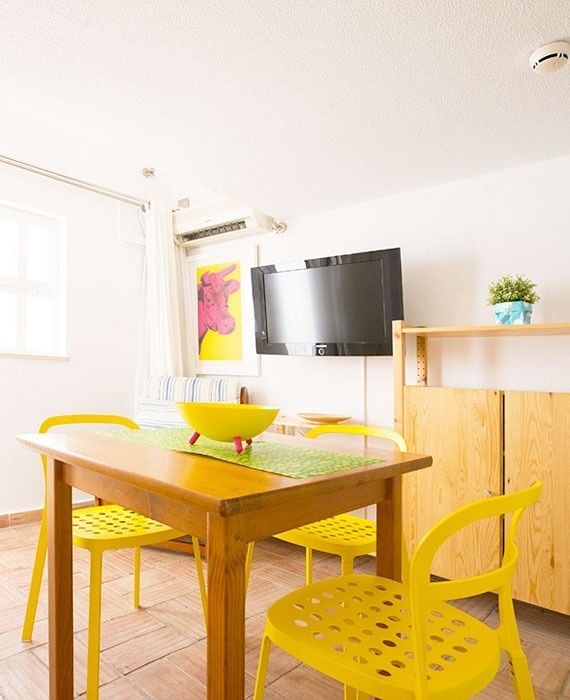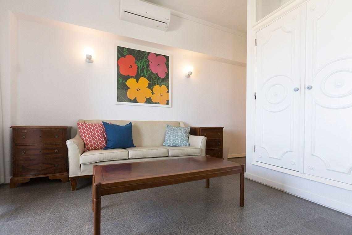 El apartamento T1 consta de 1 dormitorio con dos camas, salón con 2 sofás cama, baño completo, cocina americana con salón y terraza con vistas al jardín. Todos los apartamentos disponen de aire acondicionado, vitrocerámica, TV, minibar y acceso wifi gratuito.